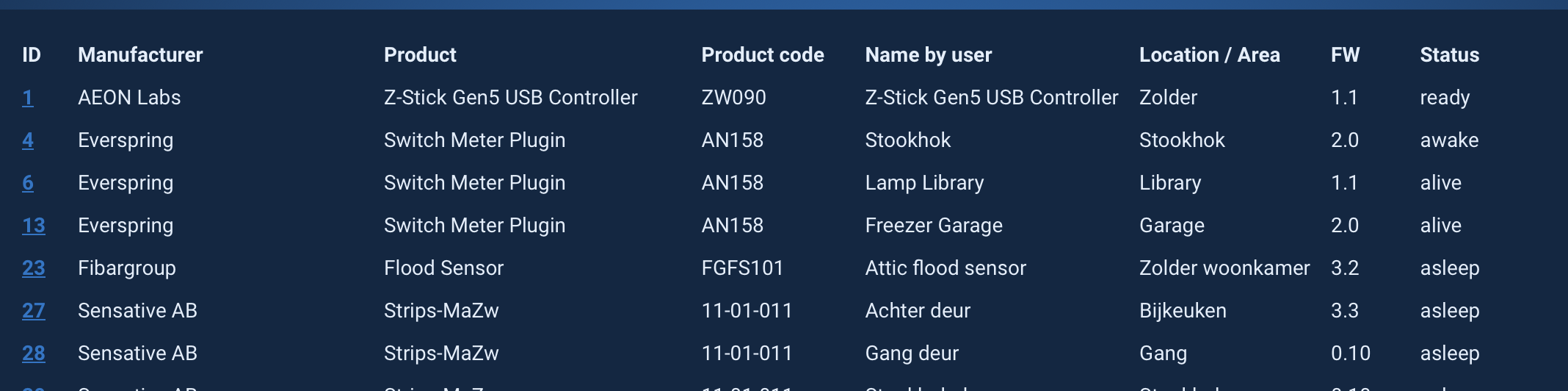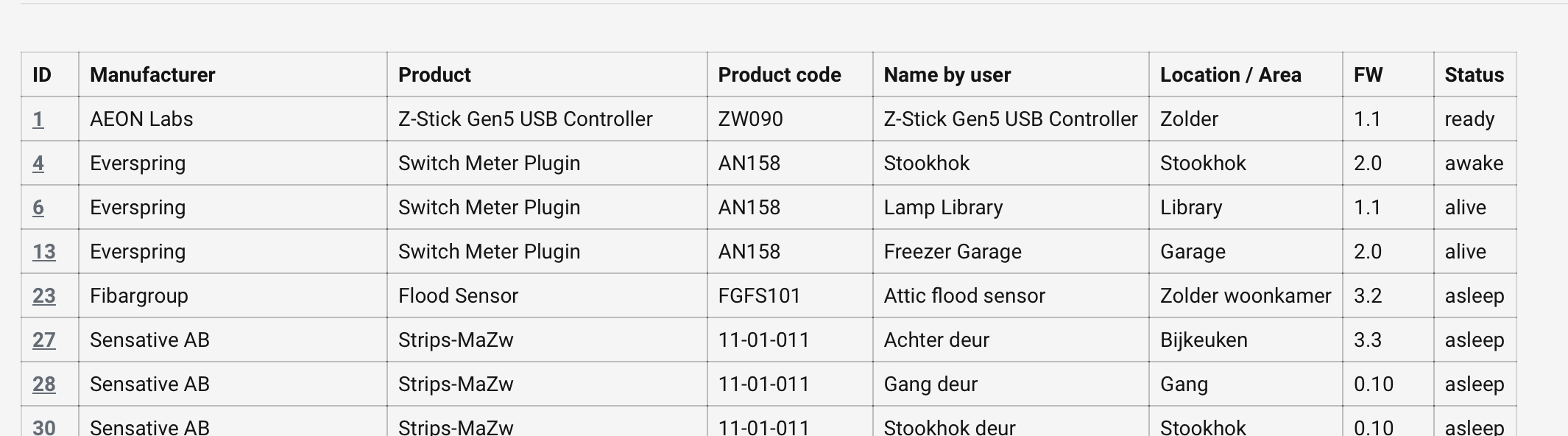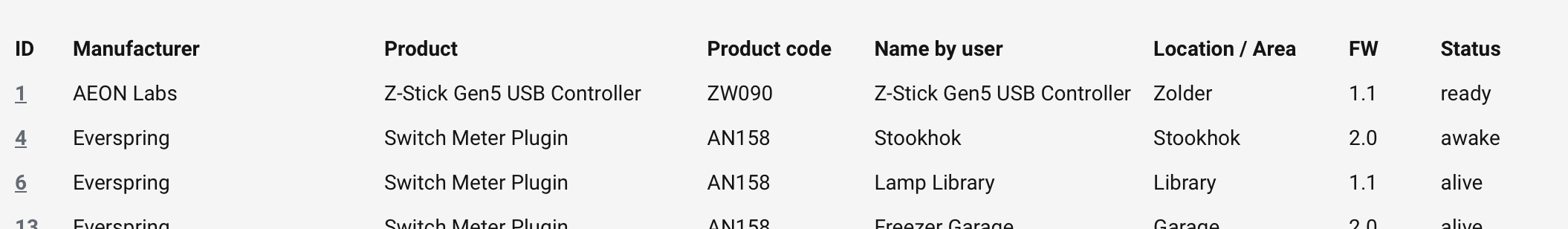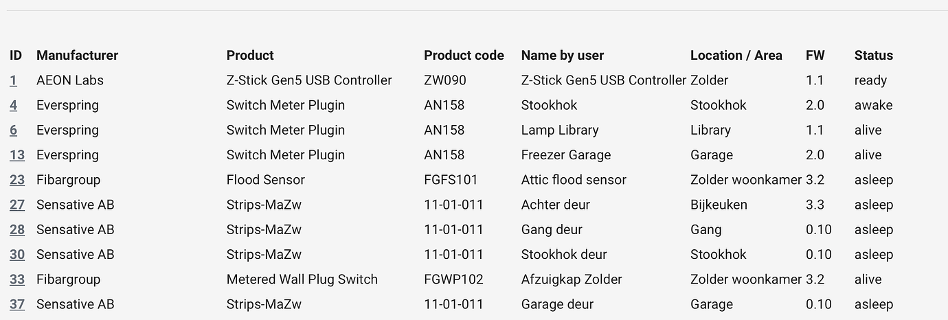 ID | Manufacturer | Product | Product code | Name by user | Location / Area | FW | Status