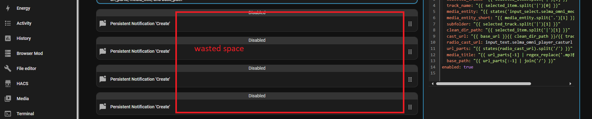 And it could have surely been something like this where the essential section (some one being editable) gains the largest section of the view, since, yes being able to see about which stage I’m in my automation is essential, but it’s much important to have a sensefull work-area which is at this point the template/YAML.