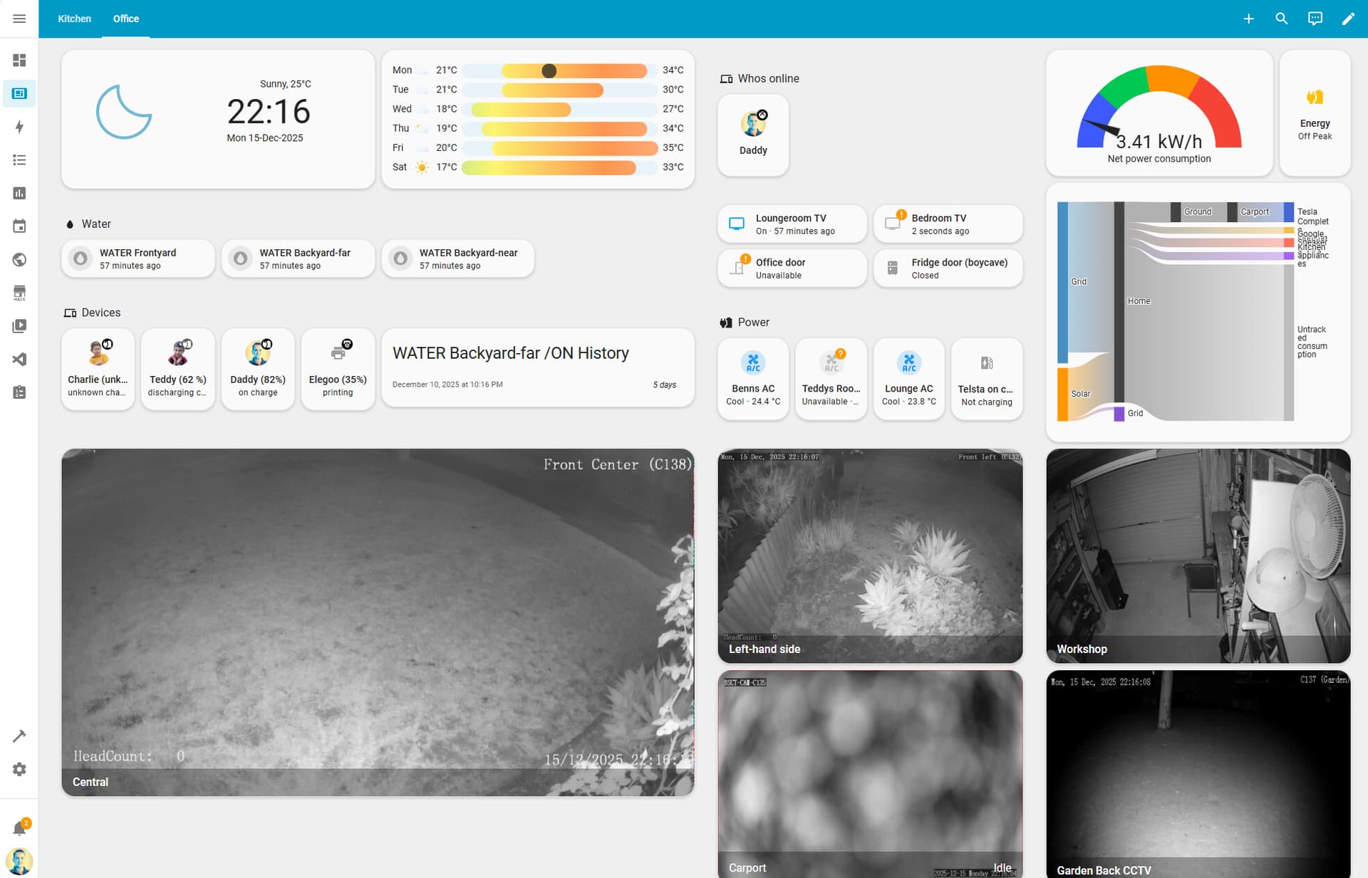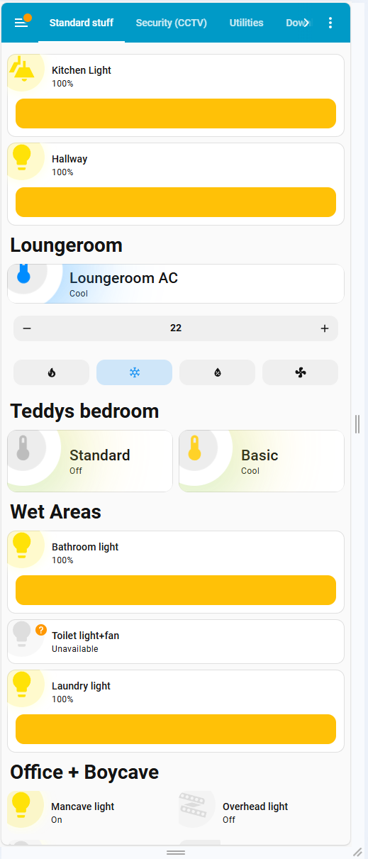 - Car/EV monitoring is done using the HACS Tesla app, relying on source data from the Telstra API.