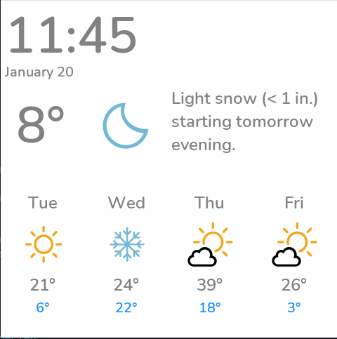 That part that took me the longest was using full color svg files for each weather icon. I now have a library that creates the icons with one line of code and another line to select the correct icon for the weather.