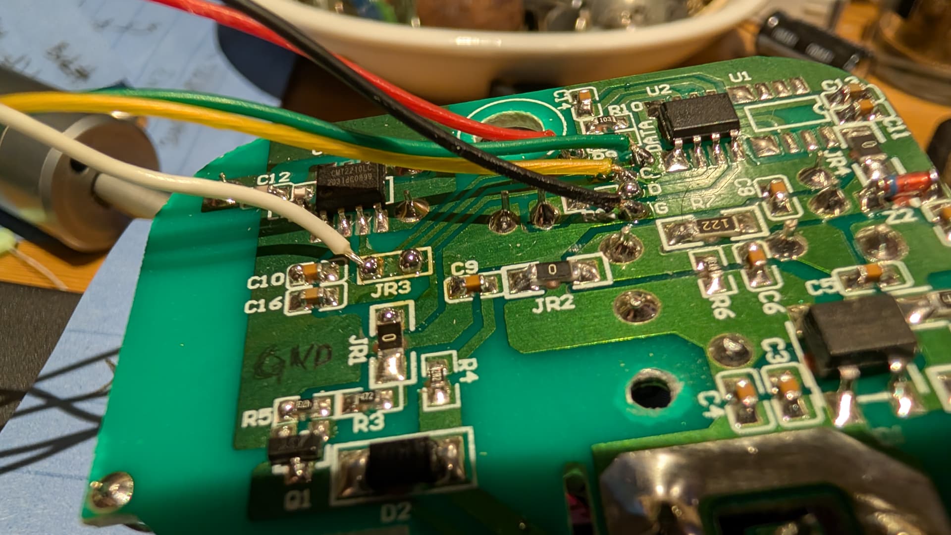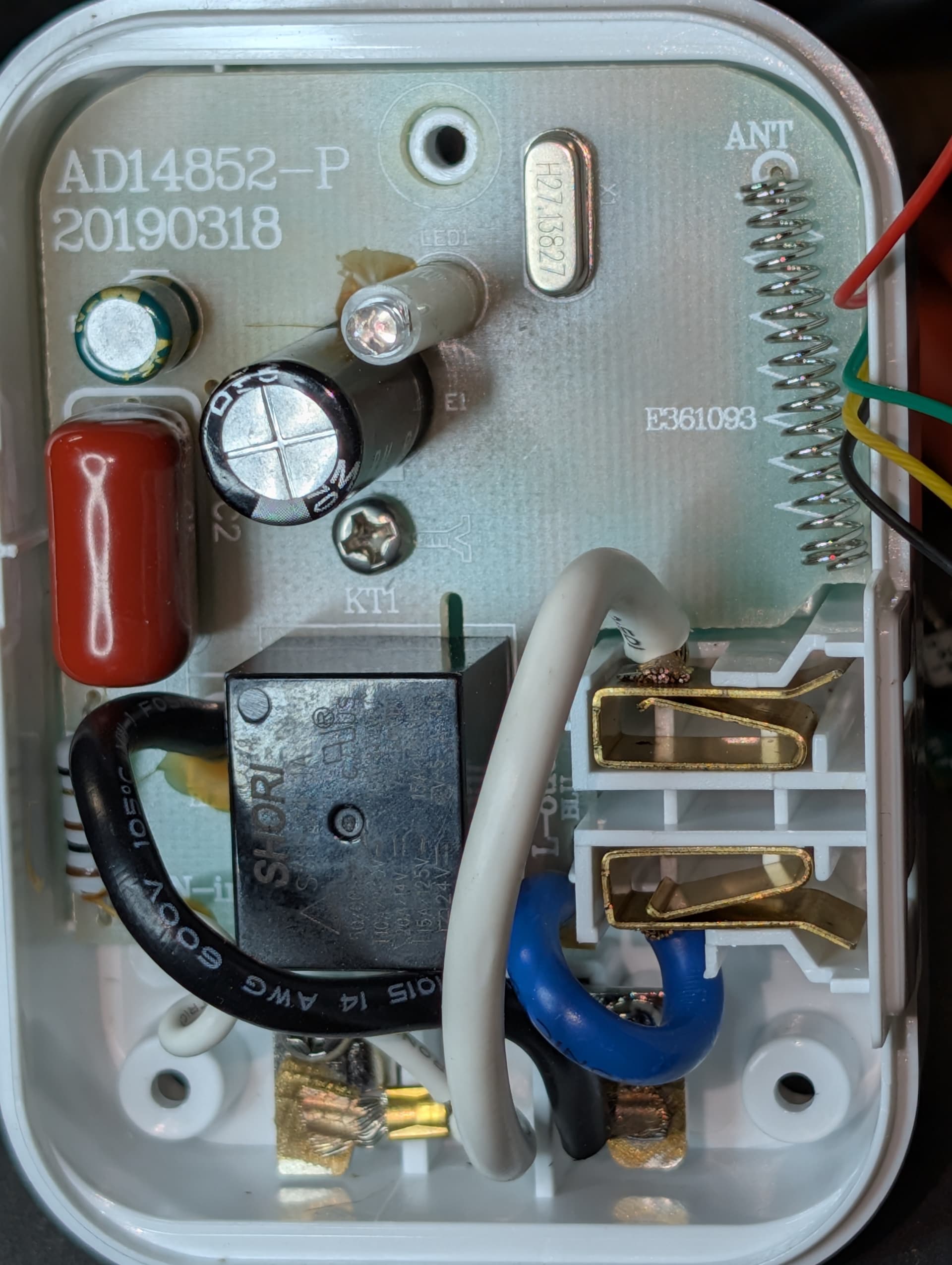 I’ve connected an ESP-01S (ESP8266) board to the outlet, that’s been flashed with the tasmota-sensors image. It’s receiving the data from the outlet’s RF demodulator, and when it’s the correct code, it’s forwarding the data to the outlet’s MCU. I removed a zero-ohm resistor (JR3) to allow intercepting the rf demod data stream. White wire sends rf demod data to ESP. Green wire receives proxied rf data from ESP into outlet’s MCU.