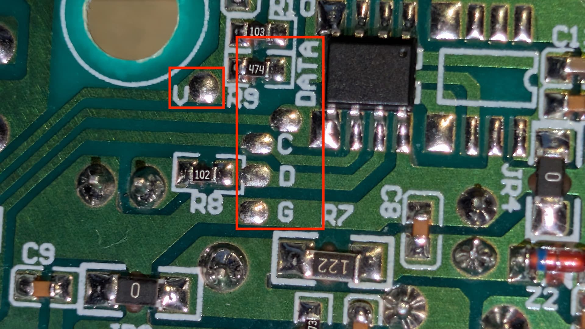 V - VCC, which I have determined to be 3.3V. I am able to power up the logic directly through this pad without plugging the outlet into the wall. (WOOT!)