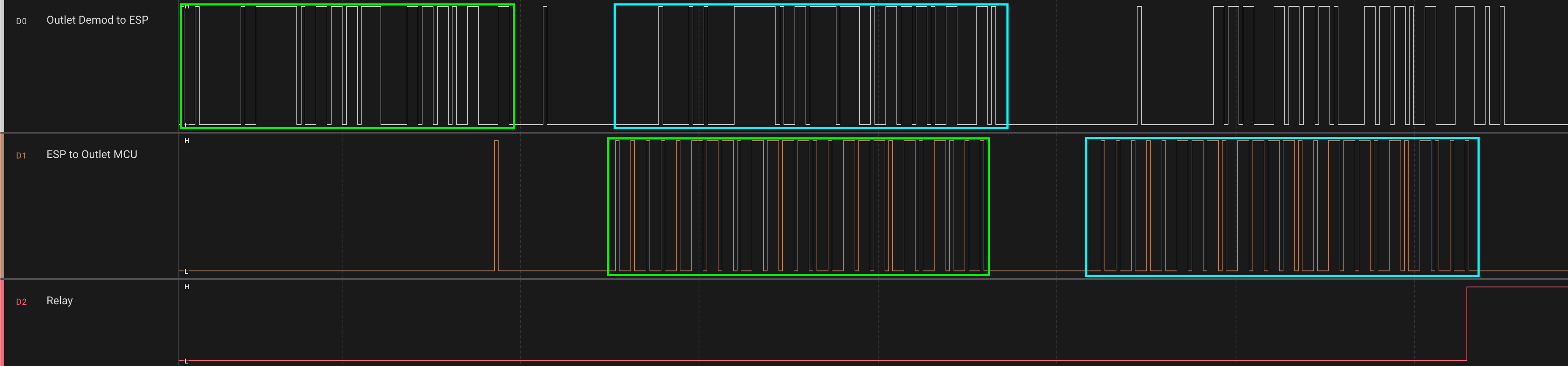 So, I believe I have figured out the transmitter data. But I haven’t figured out how to send that data over a wire to the uC in the outlet. The reason this is not straightforward is the software I’m using on the logic analyzer (Saleae Logic2) has no protocol extension that will properly decipher the wired data stream. Since it’s able to accurately read the data, I can get good info from it. But programming a uC to send that exact data will be near impossible to replicate without knowing the actual protocol.