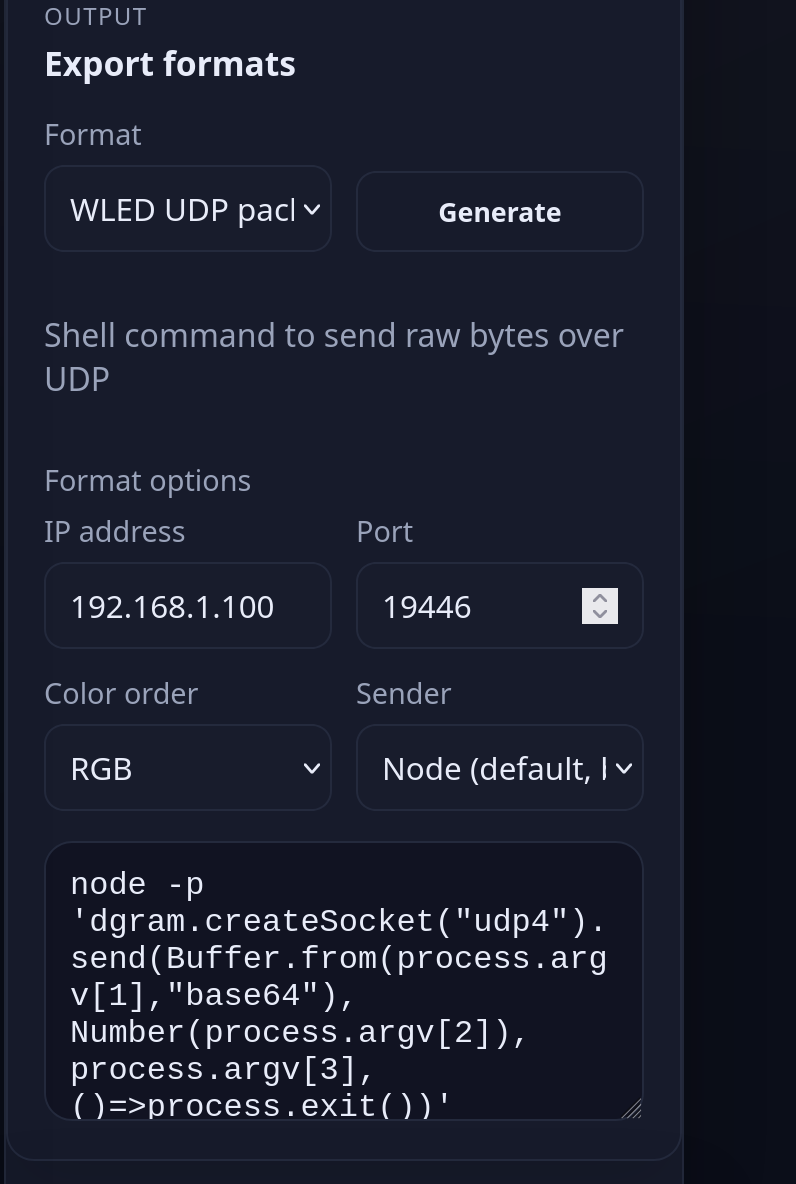This looks like a great tool. Could you clarify the process if I want to use this with WLED? Best I can tell that I create the strip, select WLED UPD, enter my WLED’s IP address, confirm RGB order, then hit generate. What is step(s) to get this into the WLED instance?