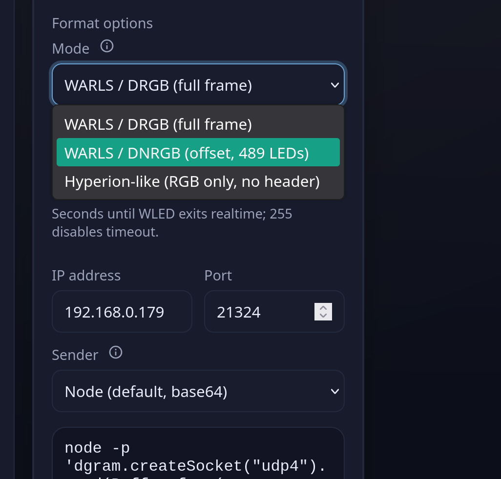 @michaelblight Hey, I added this option few days ago, but just today I’ve received WLED controller, and tested it (previous ESP-32 ad-hoc build got dismantled immediately after testing).