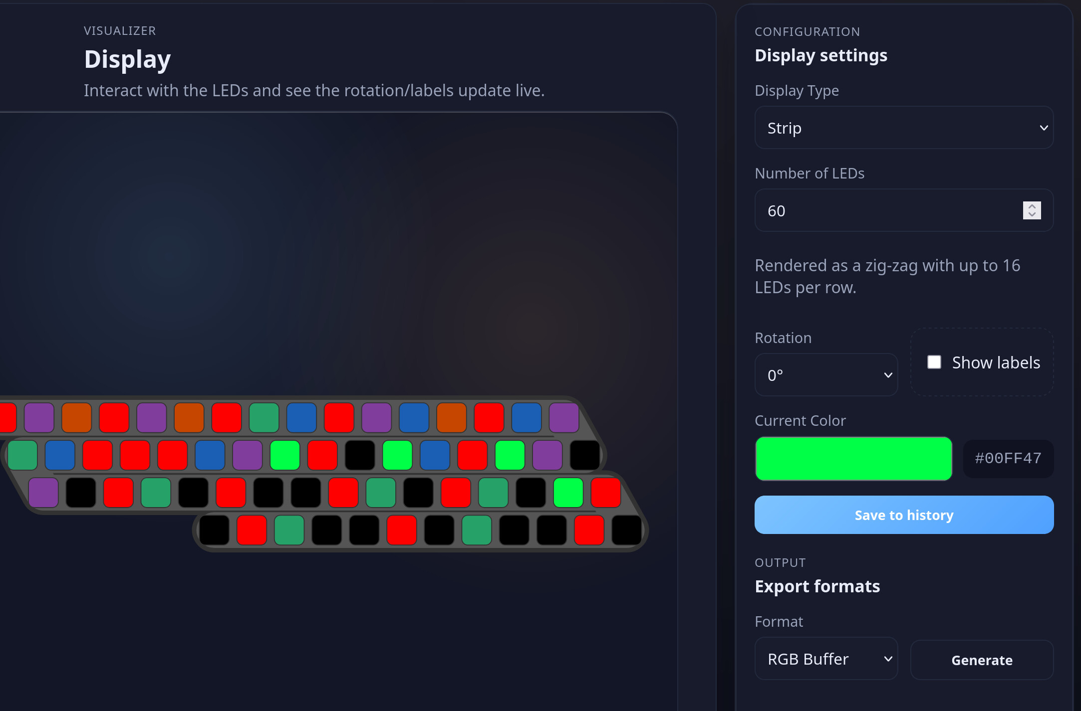Core flow: choose layout, dimensions and rotation, pick a color, click LEDs to paint.