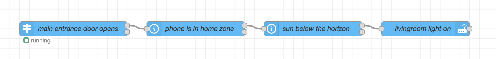 [{"id":"f36bee7a6dfde5c5","type":"trigger-state","z":"8e6ef4f6cbb13d83","name":"","server":"","version":5,"inputs":0,"outputs":2,"exposeAsEntityConfig":"","entities":{"entity":["device_tracker.dahua"],"substring":[],"regex":[]},"debugEnabled":false,"constraints":[{"targetType":"this_entity","targetValue":"","propertyType":"current_state","propertyValue":"new_state.state","comparatorType":"is","comparatorValueDatatype":"str","comparatorValue":"home"},{"targetType":"this_entity","targetValue":"","propertyType":"previous_state","propertyValue":"old_state.state","comparatorType":"is","comparatorValueDatatype":"str","comparatorValue":"not_home"},{"targetType":"entity_id","targetValue":"sun.sun","propertyType":"current_state","propertyValue":"new_state.state","comparatorType":"is","comparatorValueDatatype":"str","comparatorValue":"below_horizon"}],"customOutputs":[],"outputInitially":false,"stateType":"str","enableInput":false,"x":340,"y":2310,"wires":[["33d574a172e5ac4e"],[]]},{"id":"33d574a172e5ac4e","type":"ha-wait-until","z":"8e6ef4f6cbb13d83","name":"","server":"","version":3,"outputs":2,"entities":{"entity":["binary_sensor.door"],"substring":[],"regex":[]},"property":"state","comparator":"is","value":"on","valueType":"str","timeout":"300","timeoutType":"num","timeoutUnits":"seconds","checkCurrentState":true,"blockInputOverrides":true,"outputProperties":[{"property":"payload","propertyType":"msg","value":"","valueType":"date"}],"x":620,"y":2310,"wires":[[],[]]},{"id":"dcbc2b2e8ca85eb9","type":"global-config","env":[],"modules":{"node-red-contrib-home-assistant-websocket":"0.80.3"}}]