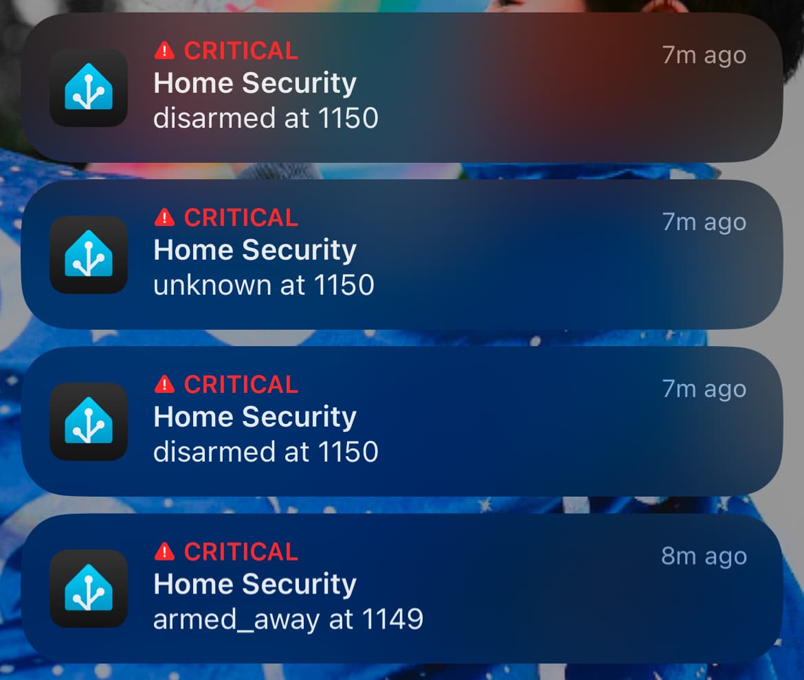 While in ‘disarmed’ state, when I leave the house, it becomes ‘armed_away’, or vice versa when I return home. In HA, I have an automation that notifies me of the changes of the alarm state and I will see that it will go from ‘armed_away’ → ‘disarmed’ → ‘unknown’ → ‘disarmed’