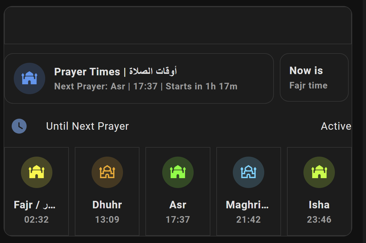 Next Prayer: {{ states(βsensor.next_prayerβ) }} | Starts in {{