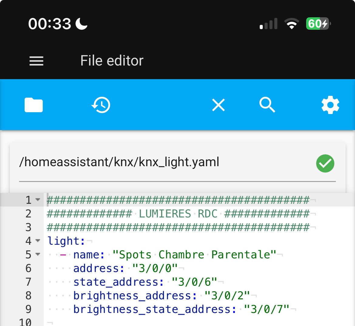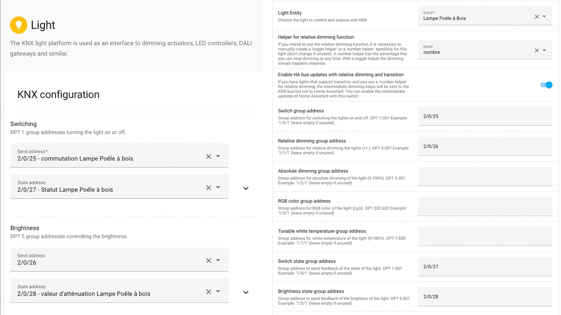 The connection between my KNX IP interface and Home Assistant is active, and all the other non-dimmable lights are working properly. I just can’t modulate the intensity of some lights via HA that are already dimmable in my house using the buttons.