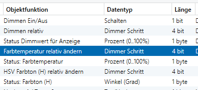 Unfortunately, I miss the option to dim the color temperature and HSV-Color relatively. I’m using the MDT Glastaster II Smart | Serie .02 and it only supports relativ dimming (DP3.007) for TunableWhite (Status DP5.001 )and RGB/HSV (Status 5.003 ?!).