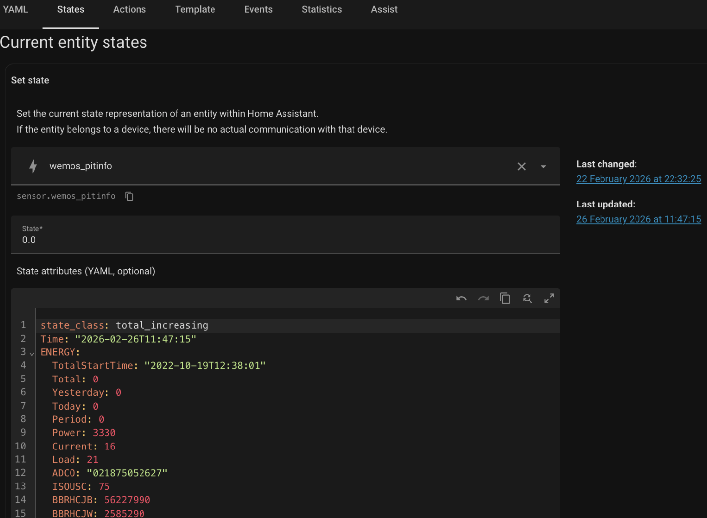 1st, see the cut/paste icon just below the sensor name, quite useful. You look for an entity, you type in a part of the name, HA finds it, you can then cut/paste it. Also the date on the right is an hyperlink to the history of the entity, which allows you to graph quickly it’s historical values. Then you can force the state and below you see the value of it and it’s various other attributes. Here my wemos.pitinfo is getting my main electric counter value (0 here because my solar PV are producing) and all other attributes.