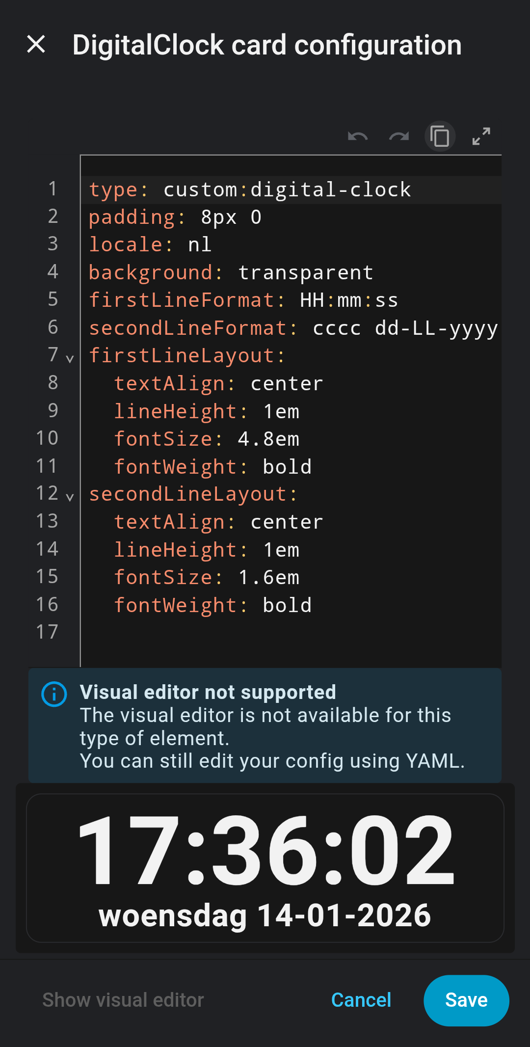 I liked the original “Digital Clock” made by wassy92x, but it lacked customization options. I know I could use card-mod to achieve similar effect, but I found more convenient to have options directly in the card.