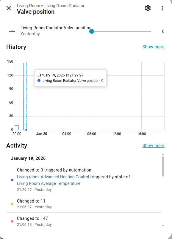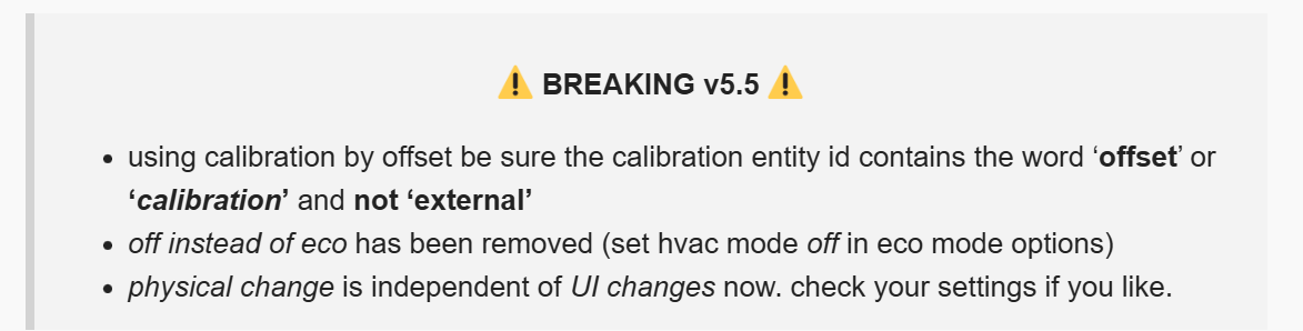 I’m using latest version (5.5.6) and I see some weird behavior. I have a radiator Comet COZB0001 (Eurotronic COZB0001 control via MQTT | Zigbee2MQTT) which supports 2 TRV modes (1 aka manual and 2 aka auto) and I can set the valve position when it is on 1. So I have set first the eco mode to be off but I see that it goes to Auto HVAC. Additional when it get triggered by the conform temp. it goes to Heat HVAC (as I set it in HAVC settings) but the valve position remains to 0. The keyword I set it to “valve_position” (entity id: number.living_room_radiator_valve_position), timeout default (20min).