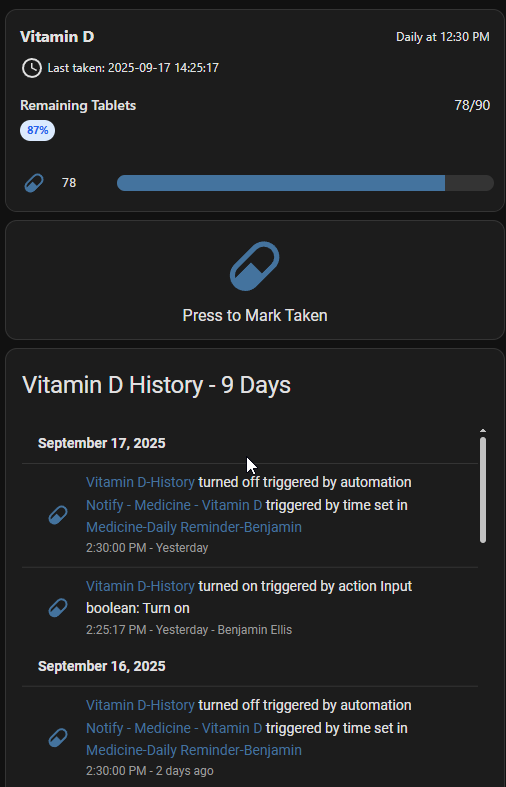 I’ve created a custom card that displays medication details, including when it was last taken, how many tablets remain, and a color-coded bar indicating the count. It also shows a percentage badge so you can quickly see how much supply is left. Here’s the complete YAML configuration for the card: