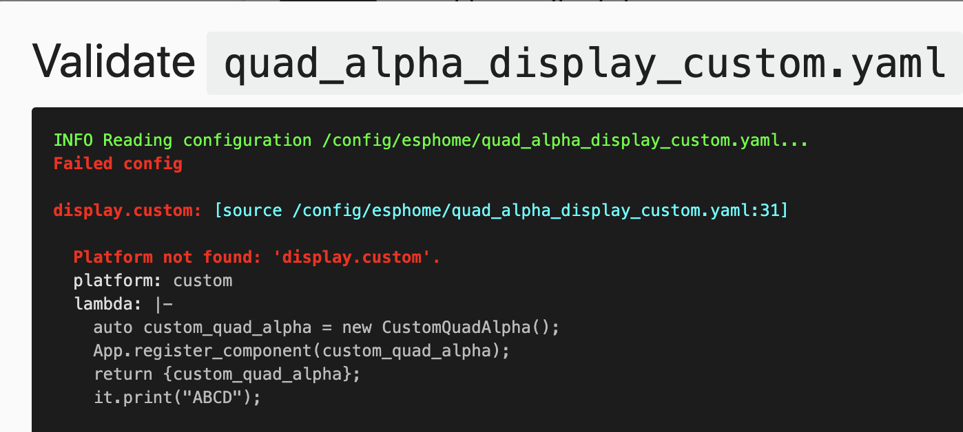 The I2C custom component examples given in the ESPHome docs are very brief, and say to read up on the custom sensor component. Most of that makes sense to me, but I’m not sure how to adapt it for a display component.