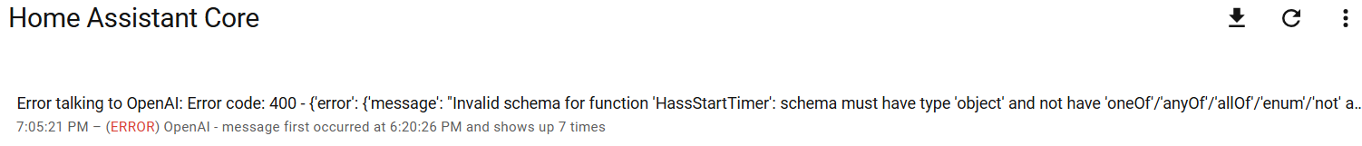 My voice assistant is configured to use OpenAI. I restarted HA again and cycled power to the voice assistant to no avail. It was working just prior to upgrading to HA 2026.1.0. Now it just responds “Error talking to OpenAI”. I guess wait for the next update?