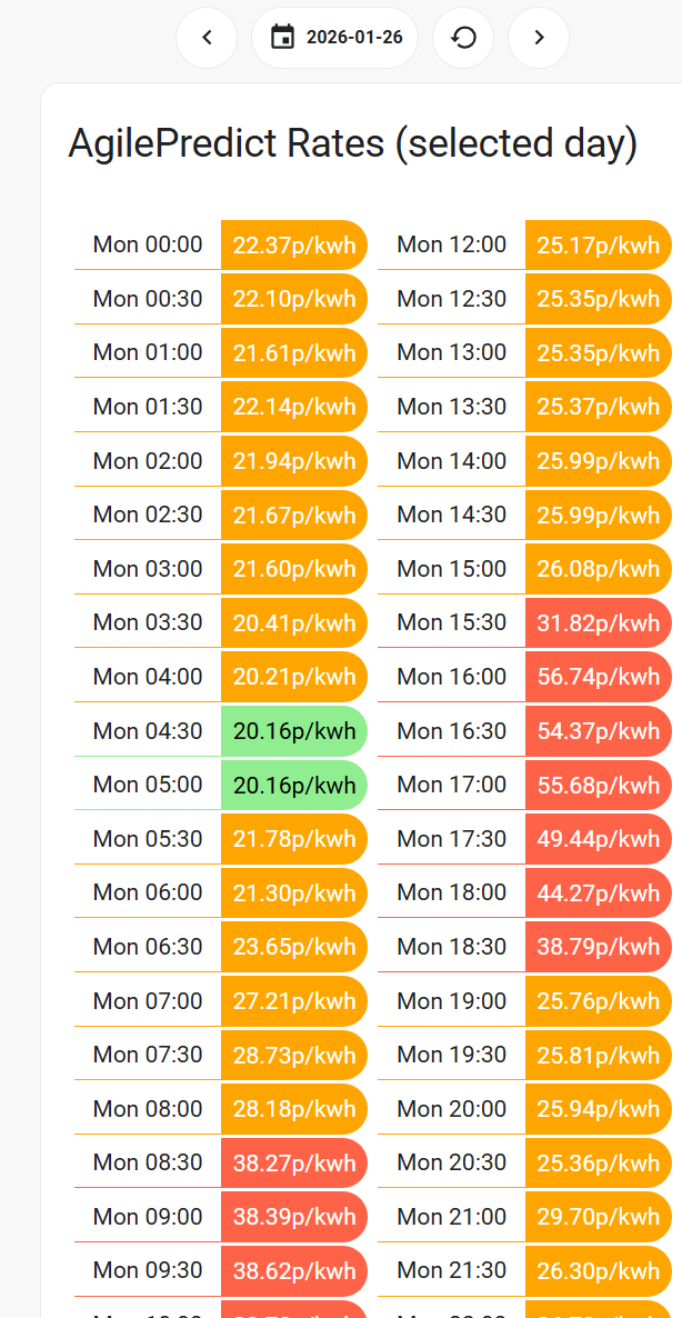 I for a long time have tried to produce an octopus agile card that shows the predicted agile rates using agile predict for each day like it does in the great octopus agile rates card. After a lot of playing with various AI, I have managed to come up with a set of instructions on how to implement it.