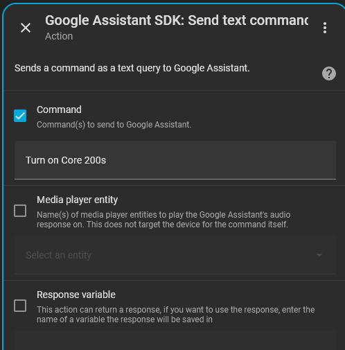 This allows me to turn it on/off and set fan speeds/modes and turn its display and light on and off by using google_assistant_sdk.send_text_command action as shown here: