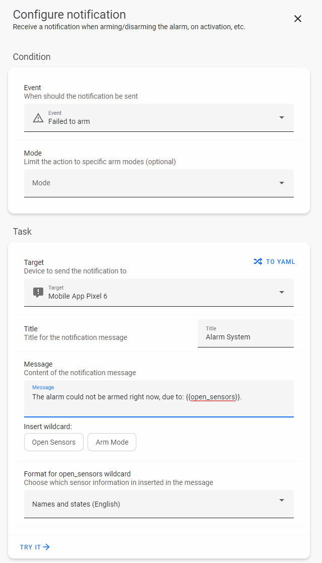 When it fails to arm like this it will fire an event, you could use that event as a trigger for an automation and have the reason sent to a device or read out via a speaker etc.