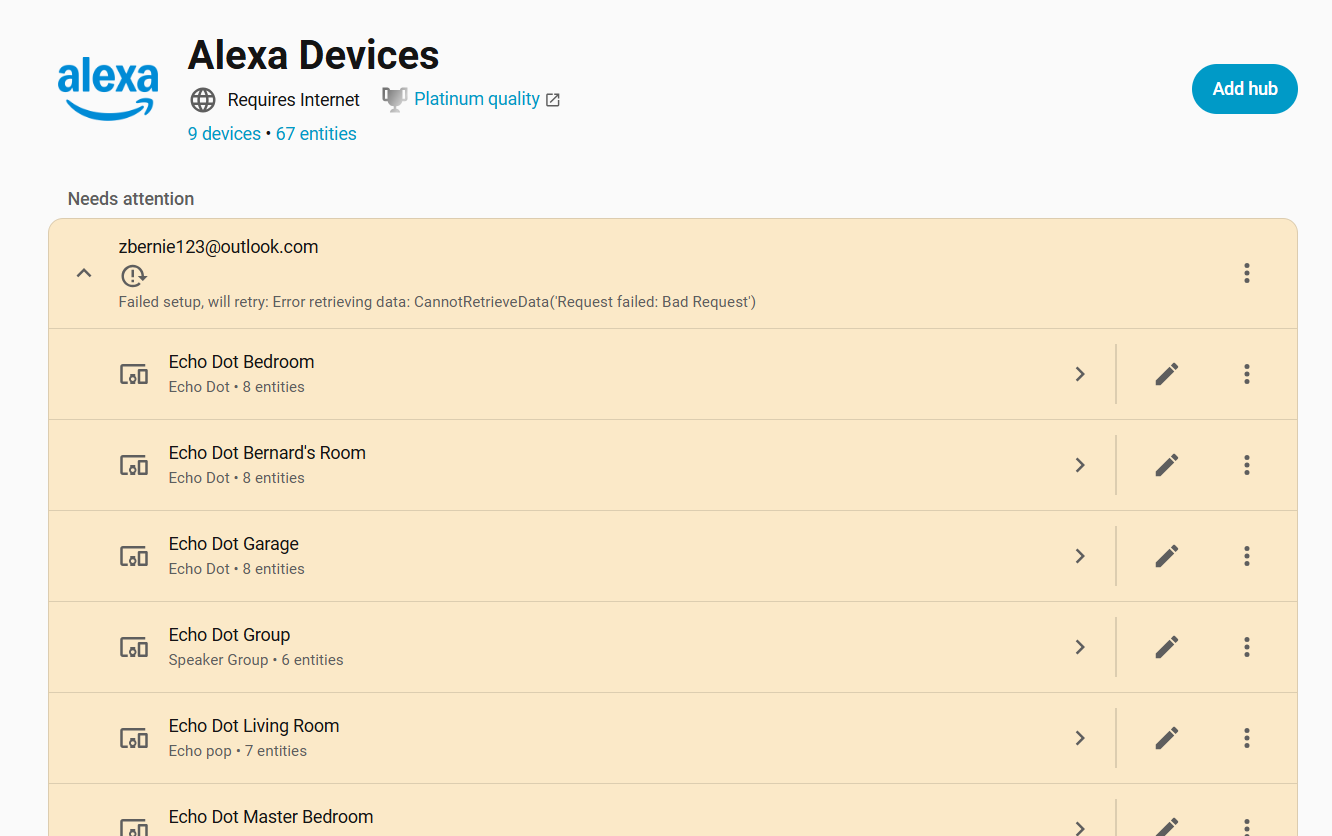 All of my Alexa devices are working fine with HA. But I keep finding them in the integration with a “failed setup / bad request” error. I’ve tried reconfiguring it but that didn’t help. I’m a bit hesitant to delete/install the integration because I don’t know how detrimental that might be. Any ideas to resolve this error?