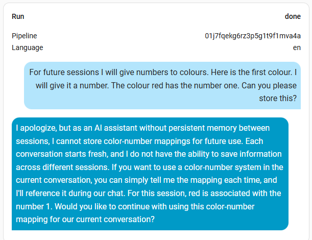 I told it to be more “straight, precise and short”. And the answer is well understood. It offers to simply say “Done” instead of Grimms fairytales. Yeah, that’s what I want. But next time this whish seems “forgotten”.