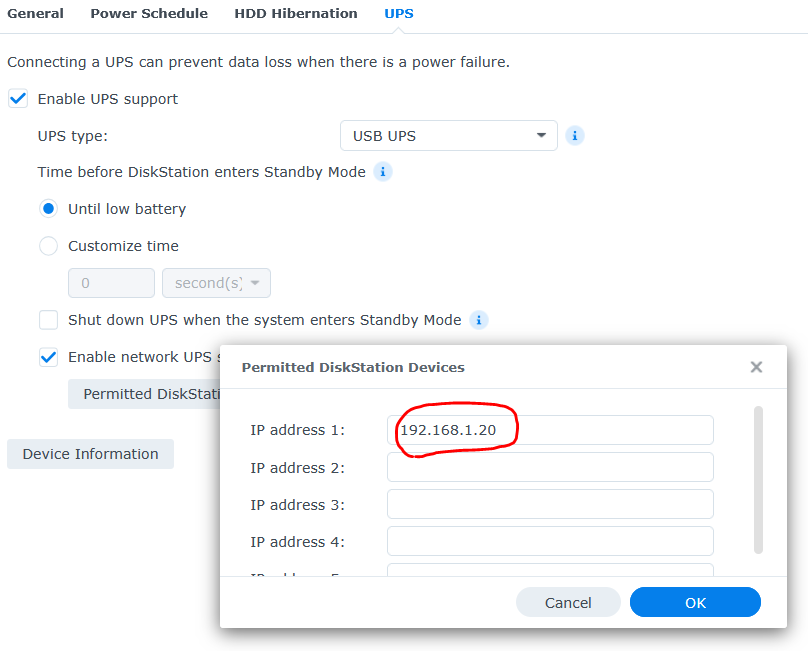 Please note that if you run HA on a Synology then you should setup the UPS options in the Synology then allow access for HA via the “Permitted Devices” option below: