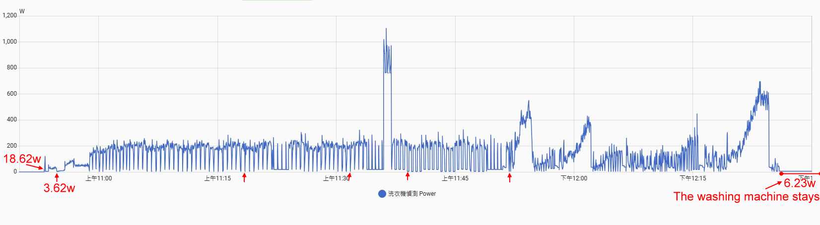 Using the green line as a reference ensures reliability; if the first 18.62-watt spike is missed, the automation will still detect the next stable section.