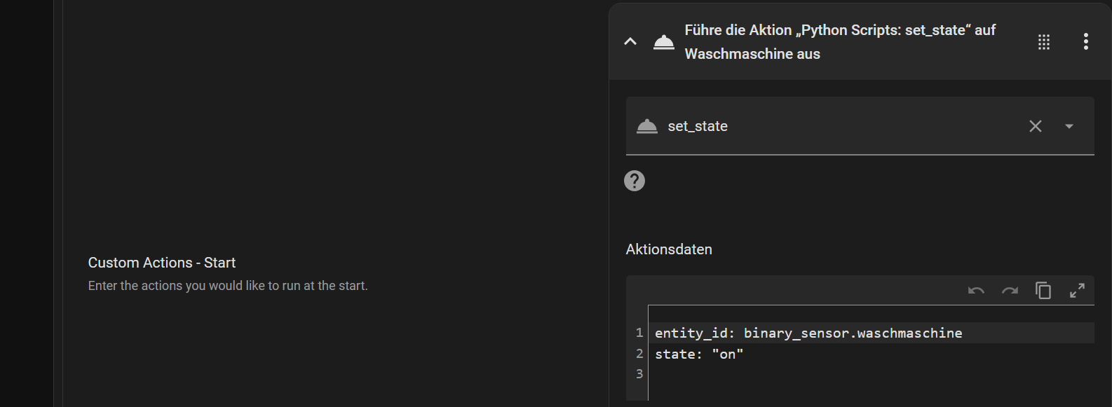 For the display in the dashboard, Iāll try a helper (binary_sensor.waschmaschine), which should be switched on and off at the start and end of the wash cycle.