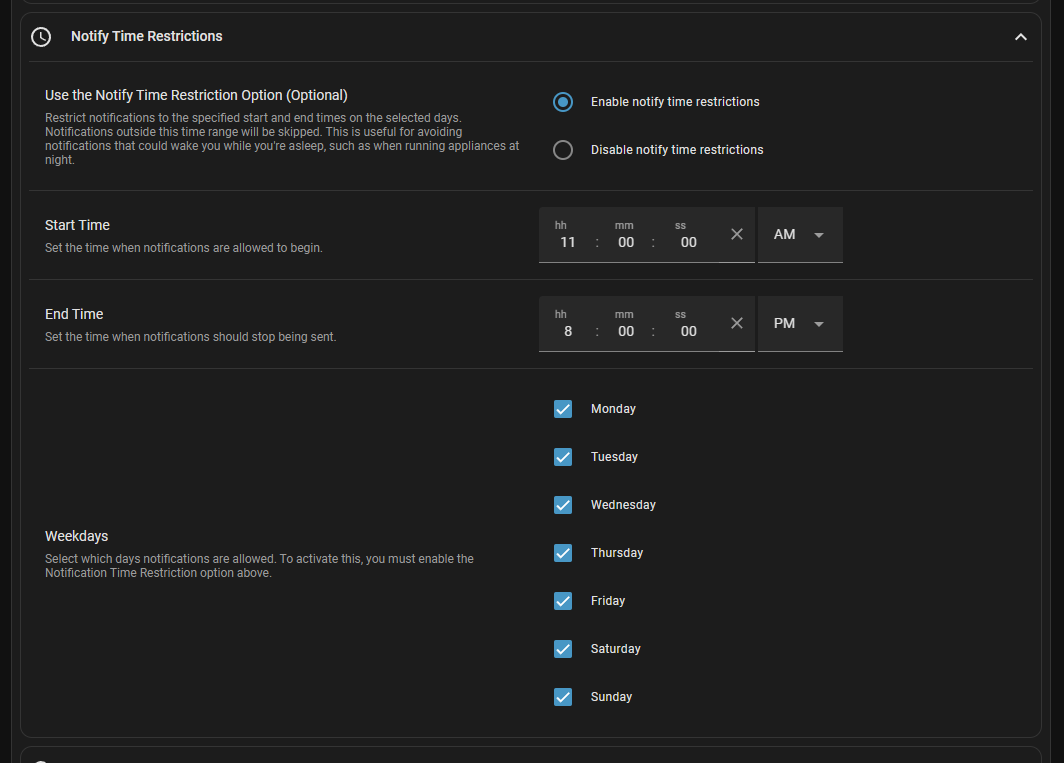 Iām having a issue where Iām getting alerts broadcast to my Echo devices based on my custom actions when theyāre outside of the Notify Time Restrictions. This morning at 9am it broadcast to my Echo devices even though itās outside of the time restrictions and woke up my daughter. Do I need to add something in my custom actions to restrict the time?