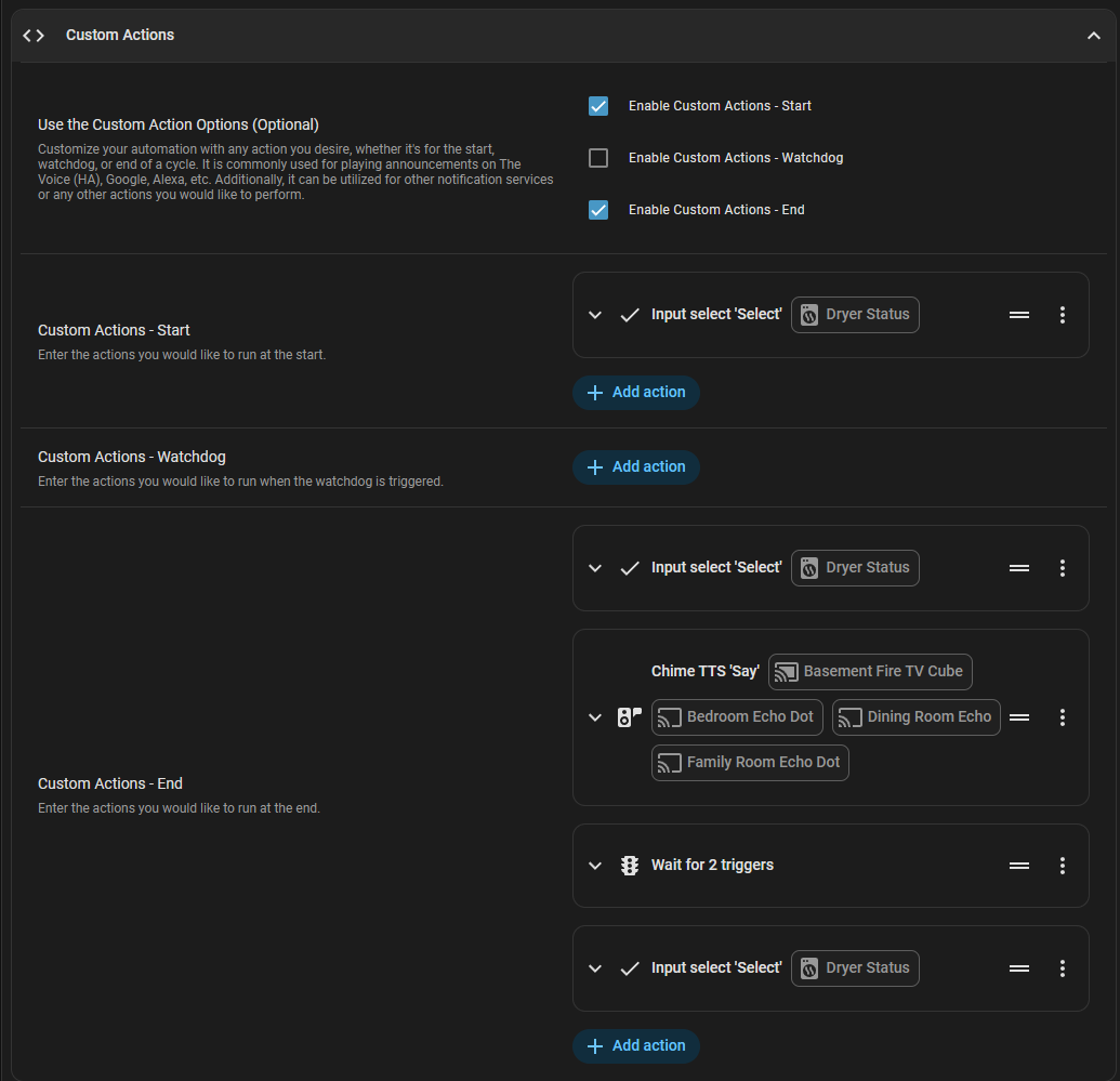 This is already built into it. Look in End Notify and the Reminder Notification Options. Select the option you would like to use and add your zigbee contact sensor on the dryer door to the Reminder Notification Entity. Below that set the following 4 inputs below.