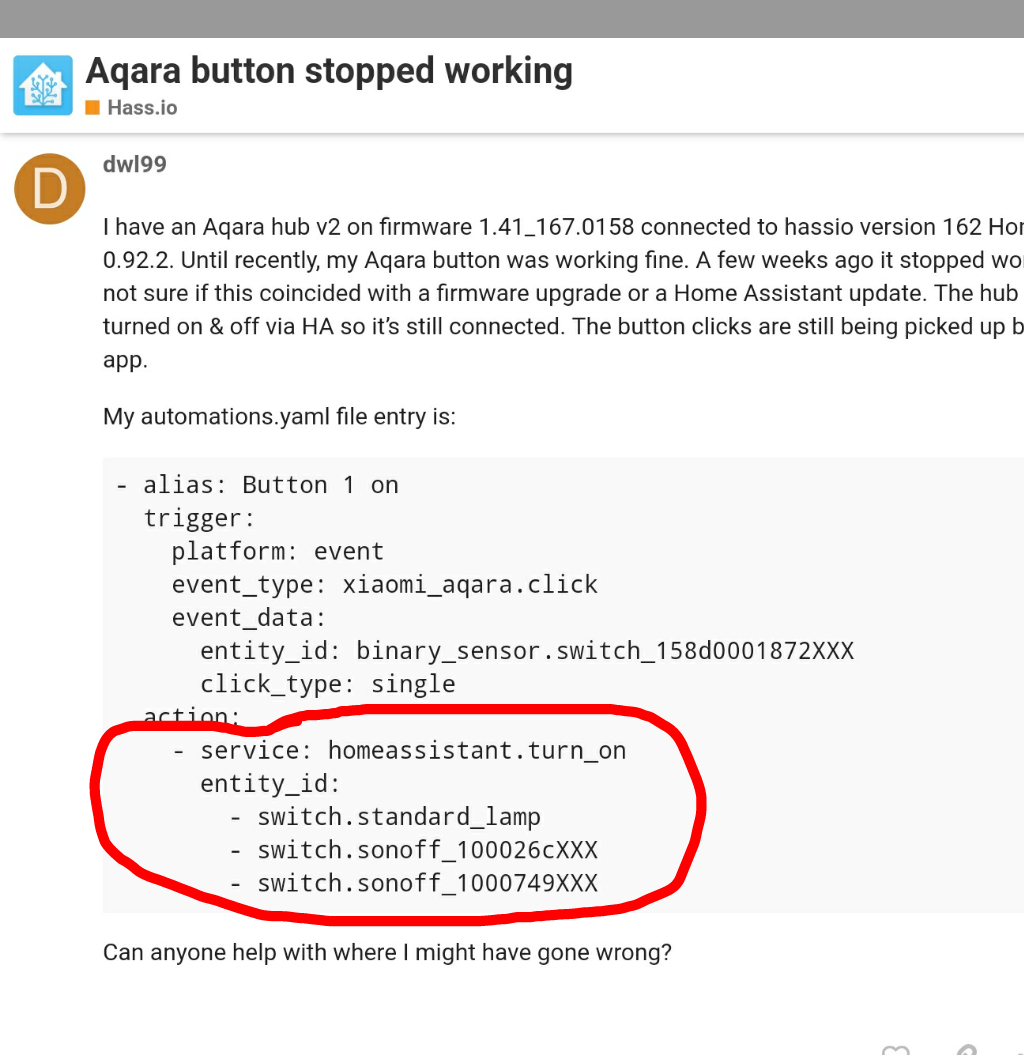 I have an Aqara hub v2 on firmware 1.41_167.0158 connected to hassio version 162 Home Assistant 0.92.2. Until recently, my Aqara button was working fine. A few weeks ago it stopped working and I’m not sure if this coincided with a firmware upgrade or a Home Assistant update. The hub light can still be turned on & off via HA so it’s still connected. The button clicks are still being picked up by the Mi Home app.