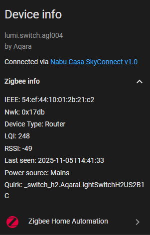 I’ve started down the path of using Zigbee devices for my network and recently bought an Aqara H2 switch with 2 buttons. The first button is physical while the second is ‘wireless’. I managed to switch it to Zigbee mode (didn’t want to try to get into Matter yet) and pair it with my SMLight Zigbee Coordinator.