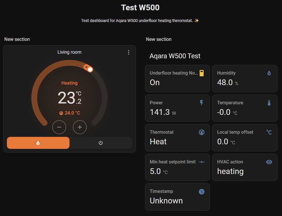 I’ve bought two W500 thermostats and installed one on a water UFH and the other on electric UFH. They both show in HA using ZHA after switching to zigbee using the mobile app, no hub required. I think there’s still a few issues though, on the electric one the power is reporting 10x less than it should. The cumulative sensor and my smart meter reported 6kWh over 3 hours which means it’s about 2kW, but the sensor is showing around 200W. The floor stat does not seem to report anything, not sure if a sensor exists. Lastly it has a few sliders for min max and calibration I think, not sure what they’re meant to do. Key thing is it reports temp and humidity and I can turn on and off the heating from HA