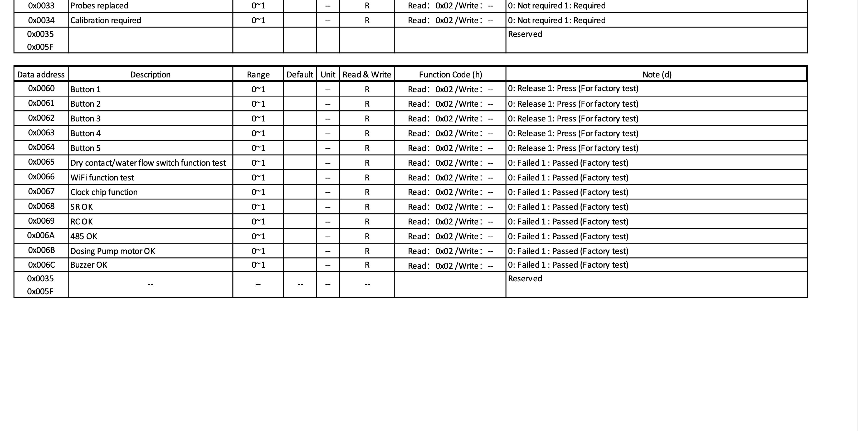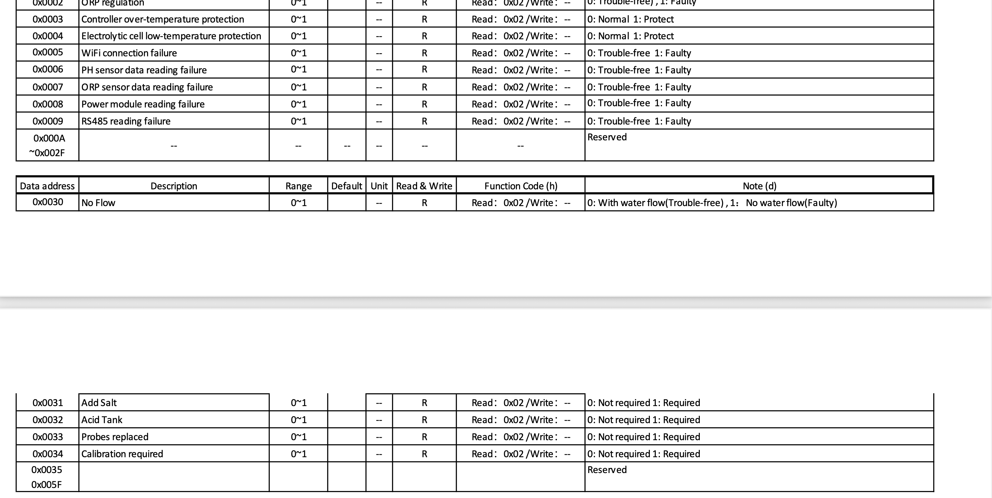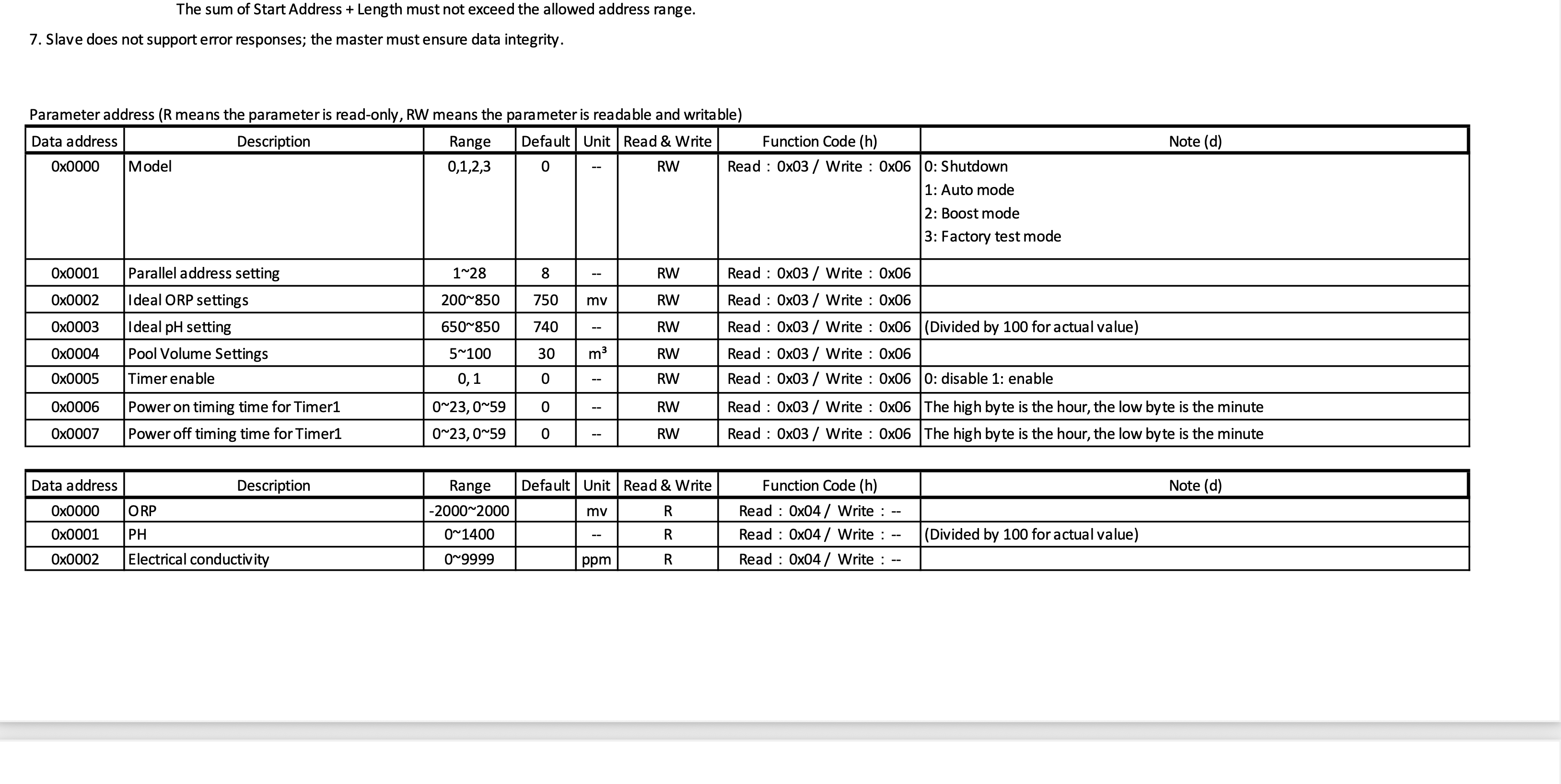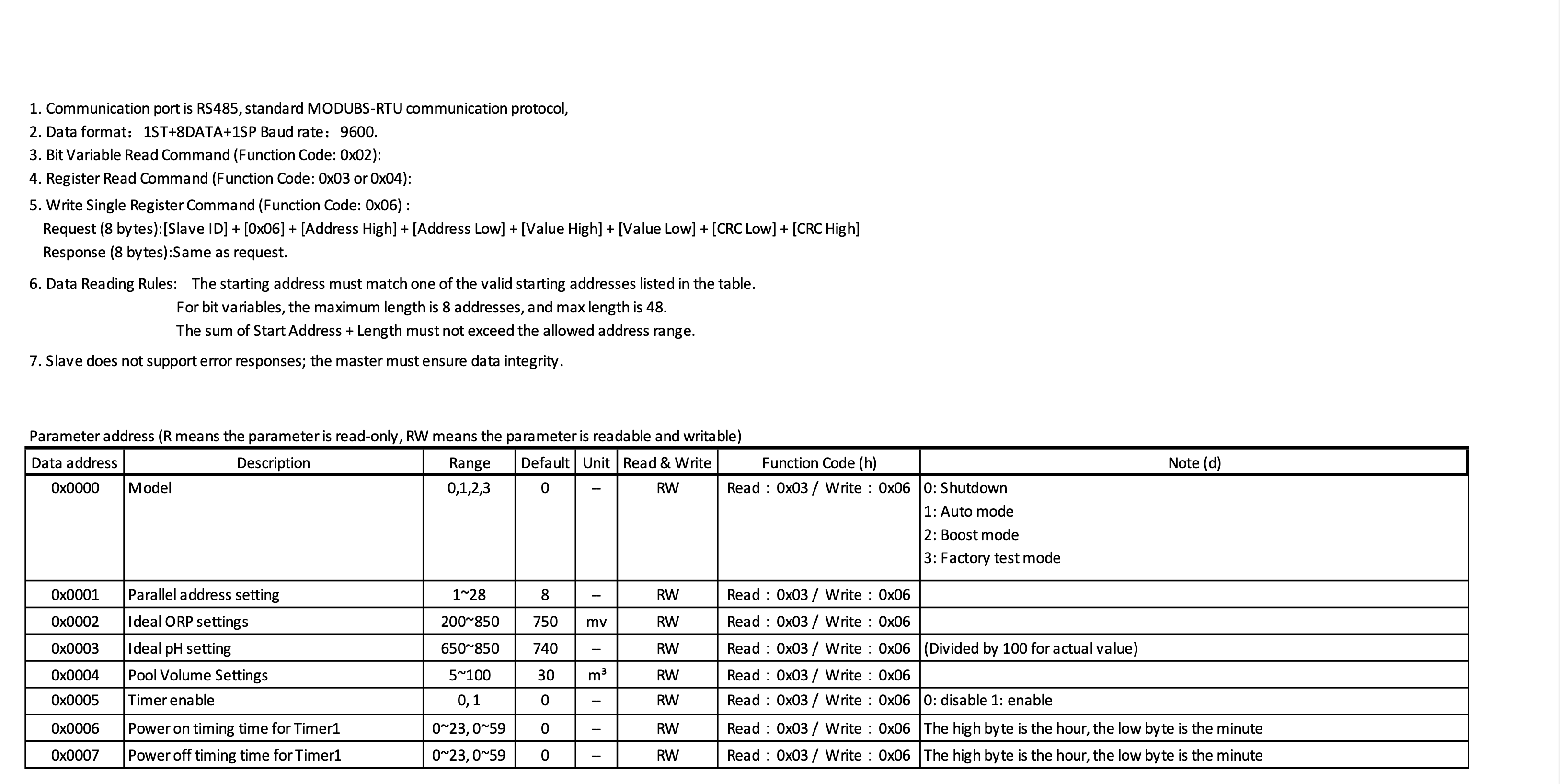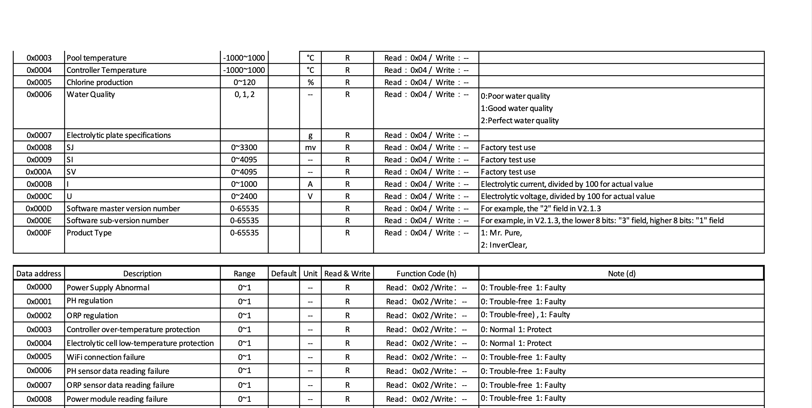 In the near future, I will publish a working version of the Mr.Pure chlorinator configuration for ESPHome. Please note that there are several firmware versions which differ in Modbus address mapping, especially for reading discrete inputs. I will publish the configuration that matches my version, and I will also attach all versions of the manuals I have for different firmware variants.