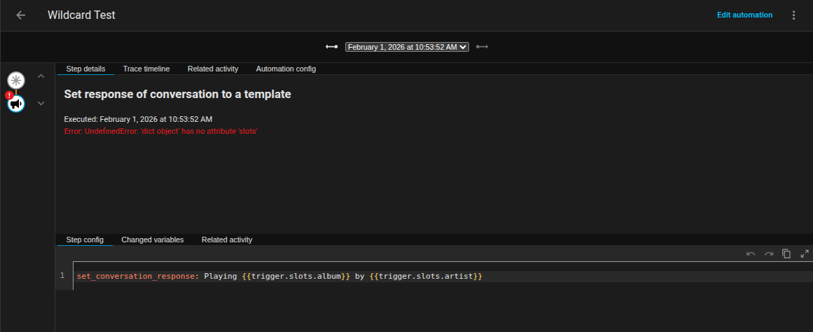 I am running HASS OS 2026.1.3 and using the HA Voice Preview. I’ve reviewed the documentation for using wildcards, triggers, etc. I first attempted to create the same wildcard example from the documentation (using album and artist as my variables) using the drop down options, but received this error: