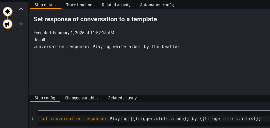 - set_conversation_response: Playing {{trigger.album}} by {{trigger.artist}}