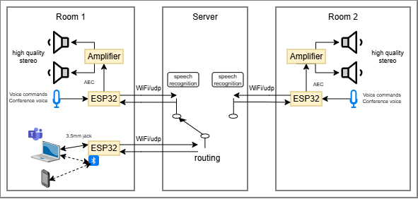 I want to connect my laptop (or smartphone) in the office, for example, via the mic/headphone combo jack or via Bluetooth, and use the installed microphone and speakers in the room. During a Teams meeting, I want to be able to move to the living room and switch the transmission there via voice command. I should still be able to issue voice commands (ideally commands would be recognized via the local microphone - not from the Teams participants