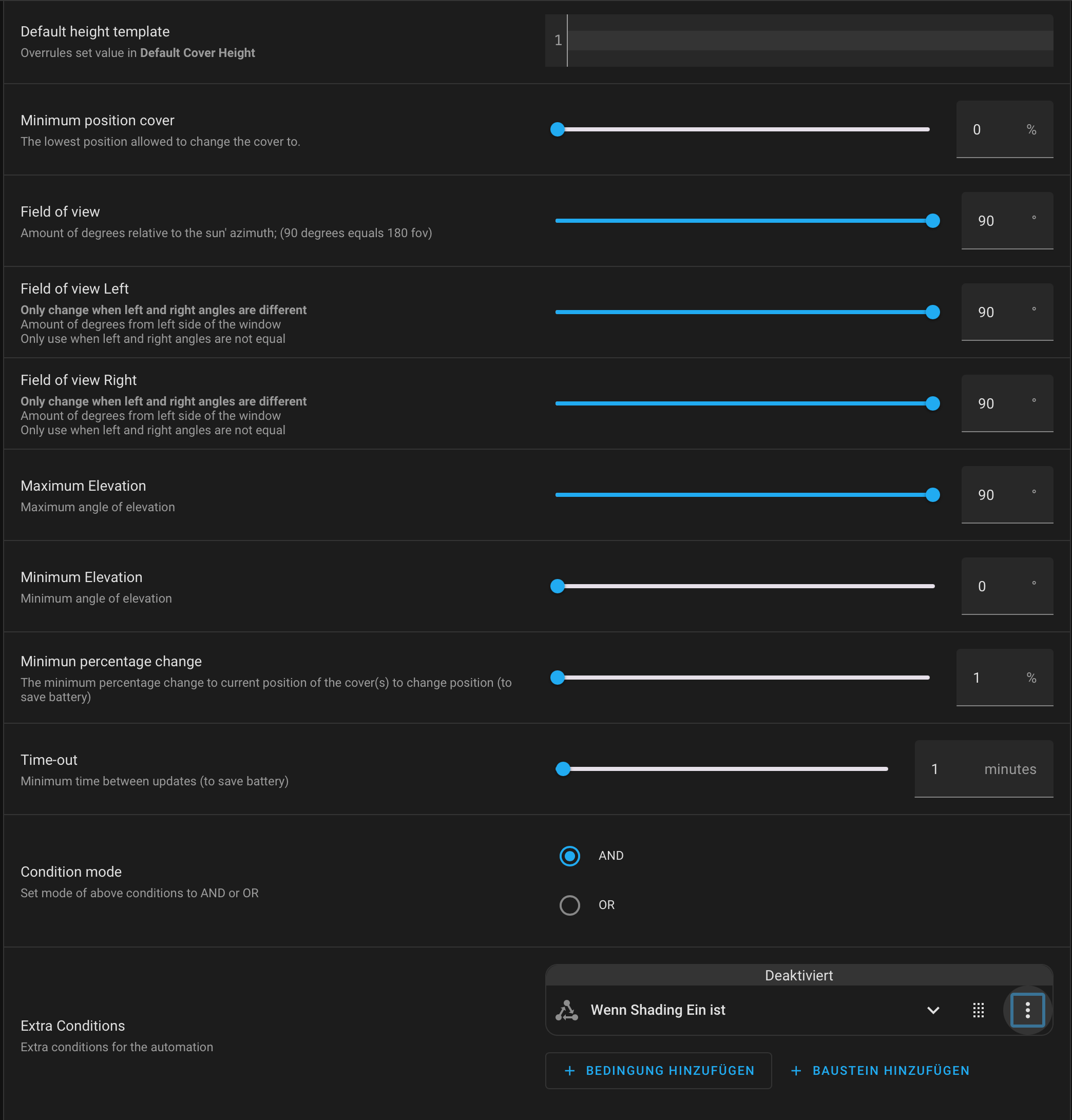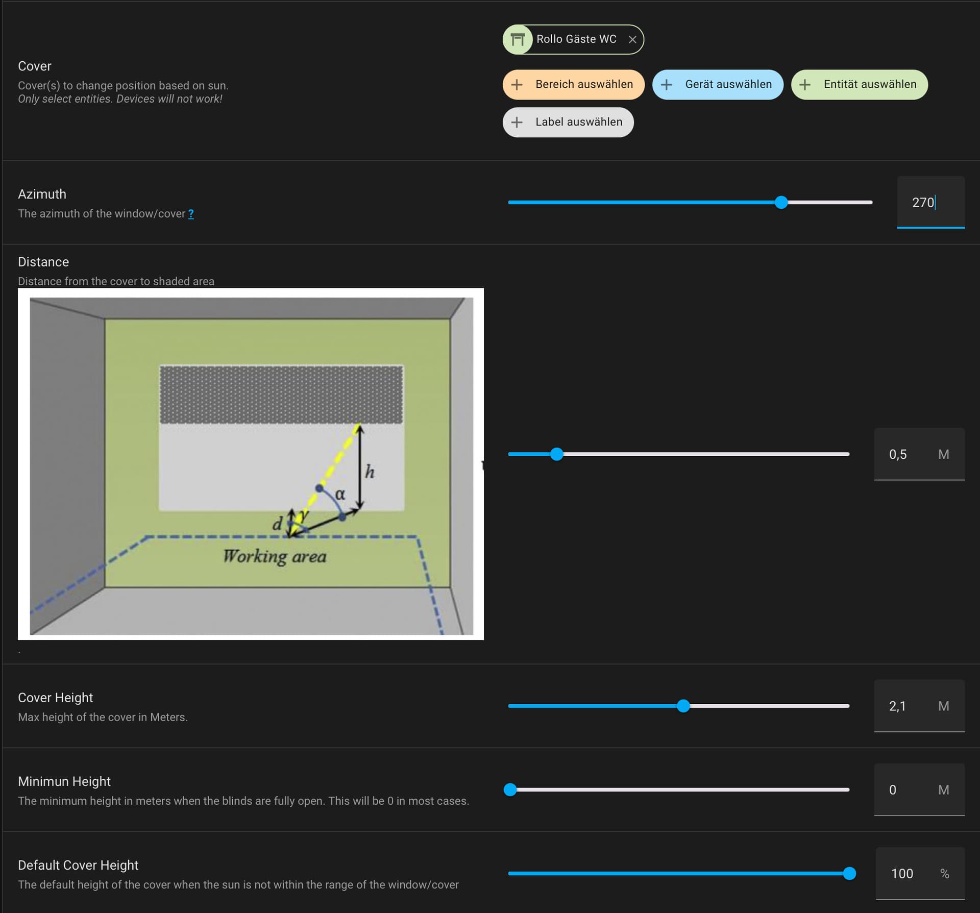 What’s missing from my point of view ist the roof windows that can be managed as an horizontal awning with 45° angle, but does not consider that the window is on a roof and the sun still reaches the windows and thus is “in front” even if the sun is already “behind it” based on the calculation (but in reality is still somewhere above the roof)