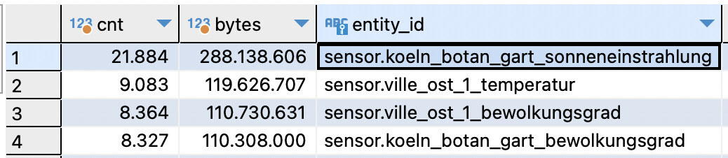 Ran it and - as assumed - weather data is the biggest. In my case a sensor for the UV Index sensor.koeln_botan_gart_sonneneinstrahlung, which seems to have a time series as attribute. 4 biggest sensors use more that half of the state_attributes size.