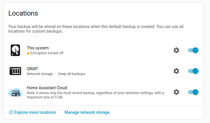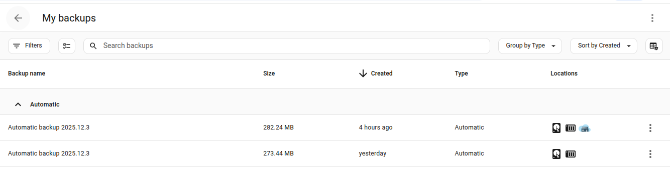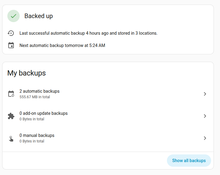 - 3 backups stored on my Home Assistant system
