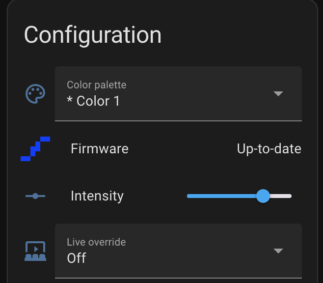Also WLED on/off state will correspond to chamber light entity. When you turn it on/off the WLED light will turn on/off too. In case printer is in a finish state turning off the chamber light or opening/closing enclosure door is going to switch preset to idle. This is configurable if you don’t want to wait for finish to idle timeout.