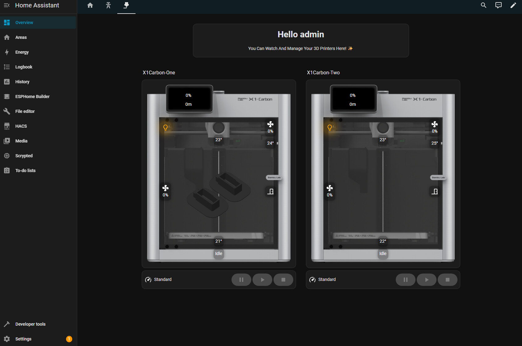 Hi, I’ve implemented a custom card to display info from the ha-bambulab integration. Personally, I think it turned out minimalistic and quite handy, so I decided to ask if anyone would be interested in using it as well. I haven’t configured HACS automatic integrations yet and don’t want to spend time learning if nobody needs it. I’ll still gladly set it up for anyone willing to give it a try.