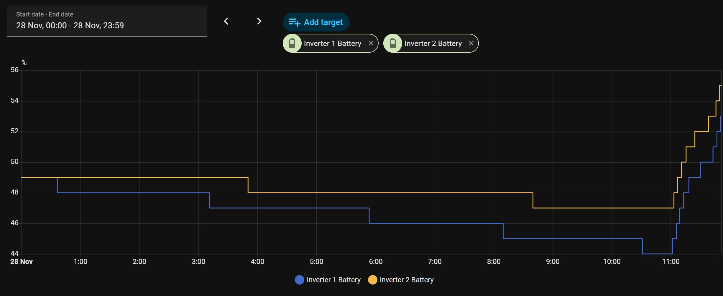 A graph of battery percentage over the day would be super useful to see alongside how much energy is being sent to or drawn from the batteries. @davidrapan I don’t want to know “now”, I want to know how it tracks against the other metrics. It would be super useful to identify if I’m routing too much solar energy to the batteries or not enough.
