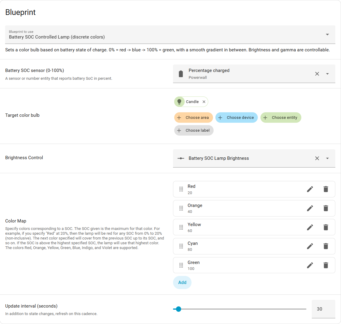 A simple Home Assistant blueprint that sets the color of a smart color-changing bulb based on the current battery state of charge (SoC). This makes it easy to glance at a light and know whether your home battery is low, mid, or full — ideal for Powerwall, solar, or any battery integration (though it would be a bit weird to use for your phone!).