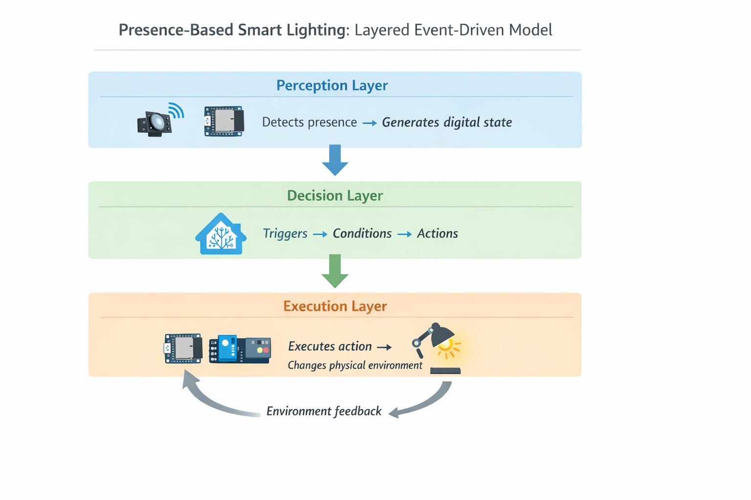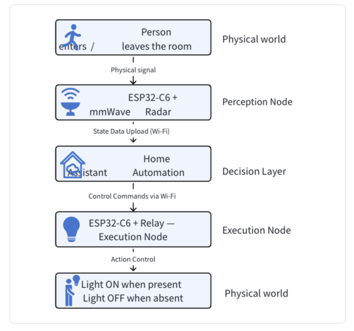 As illustrated in the diagram, the system operates as a distributed, event-driven architecture. The perception layer converts physical changes into digital states, the communication layer transmits data via Wi-Fi and MQTT, the decision layer evaluates automation logic within Home Assistant, and the execution layer controls the relay to turn the light on or off according to the generated commands.