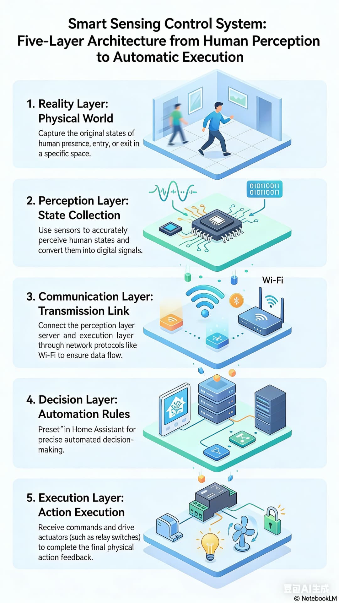 | Automation Logic Optimization | Please draw a layered diagram of a smart home system, labeling the perception, communication, decision, and execution layers along with data flows, and explain the key function of each layer. |