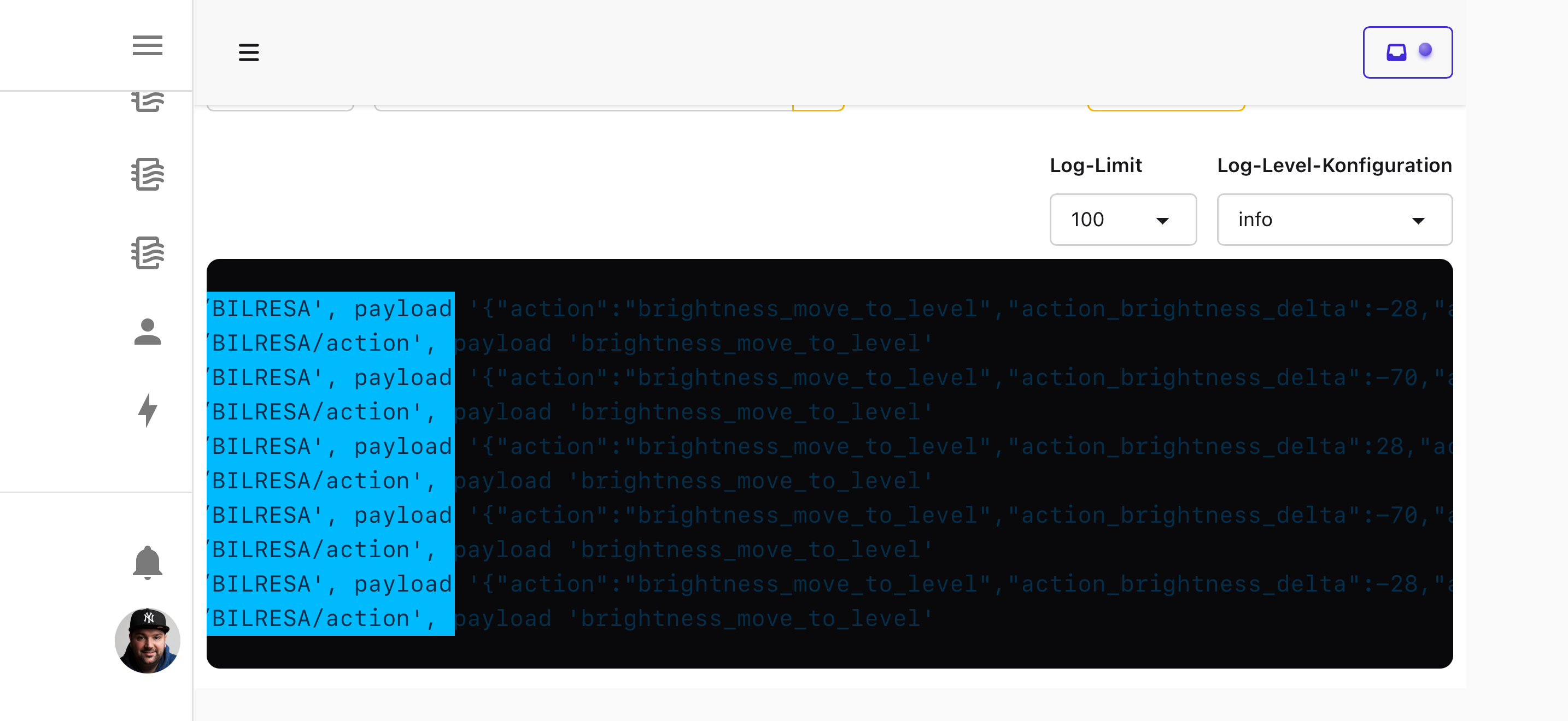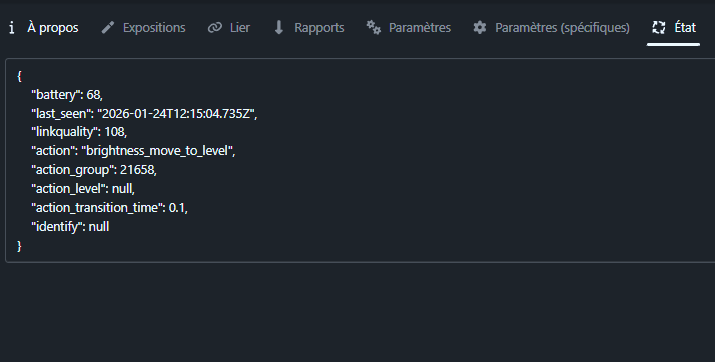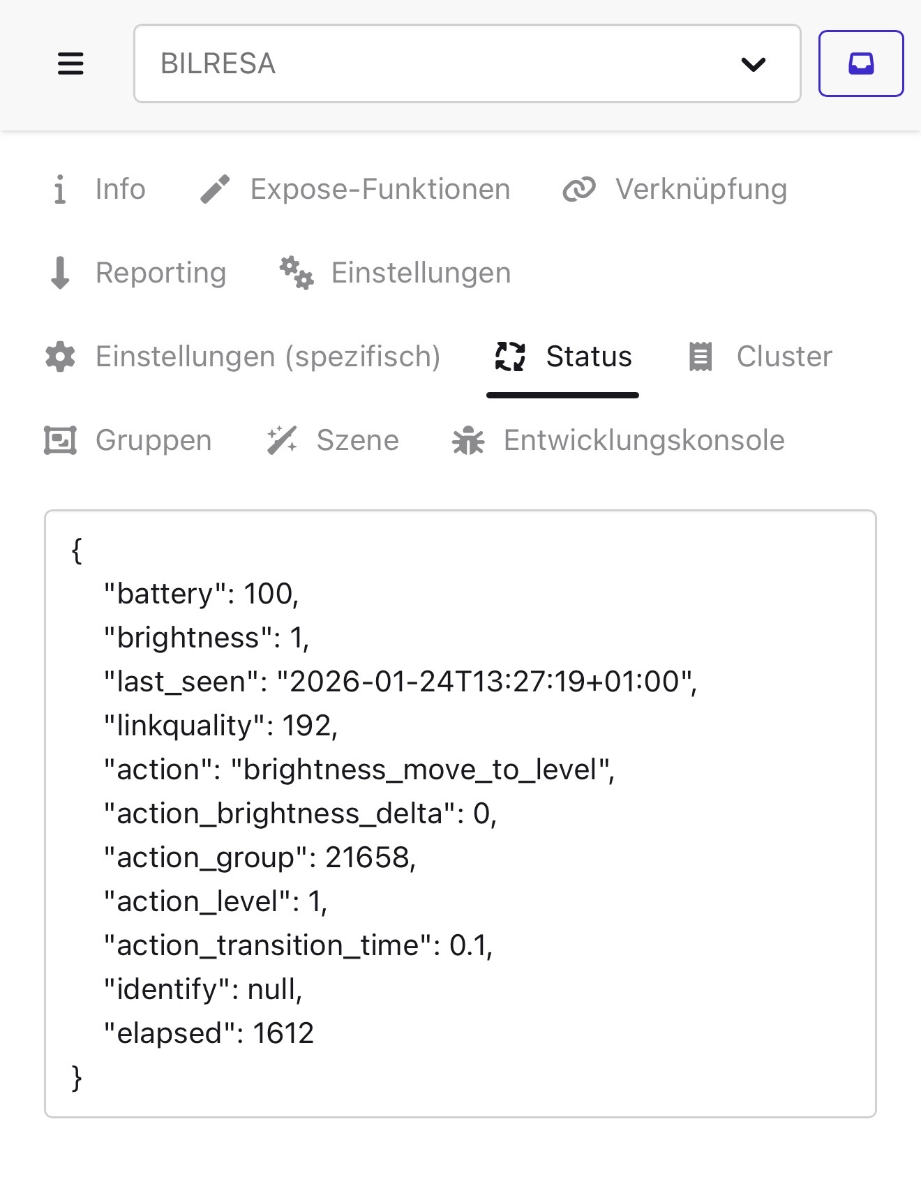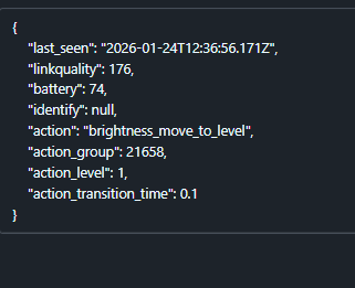 [24/01/2026 13:17:34] z2m:mqtt: MQTT publish: topic 'zigbee2mqtt/BILRESA Mika', payload '{"action":"brightness_move_to_level","action_group":21658,"action_level":171,"action_transition_time":0.1,"battery":68,"identify":null,"last_seen":"2026-01-24T12:17:35.959Z","linkquality":108}'