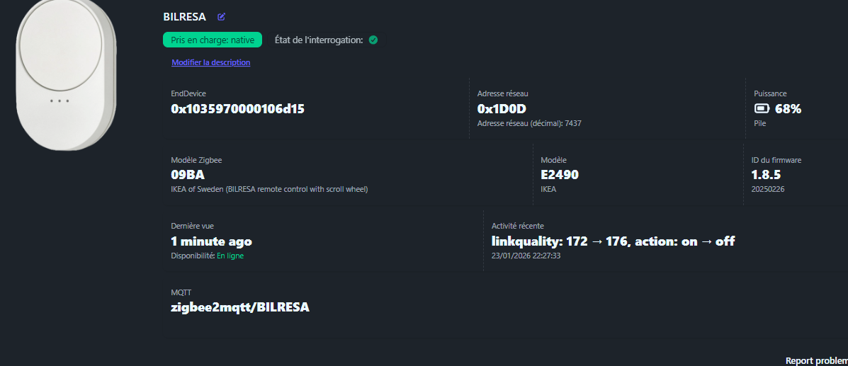 [24/01/2026 13:17:50] z2m:mqtt: MQTT publish: topic 'zigbee2mqtt/BILRESA Mika', payload '{"action":"brightness_move_to_level","action_group":21658,"action_level":157,"action_transition_time":0.1,"battery":68,"identify":null,"last_seen":"2026-01-24T12:17:51.762Z","linkquality":104}'