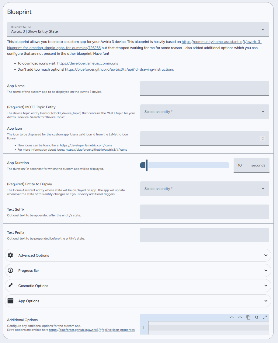 This blueprint lets you create highly customizable AWTRIX apps directly via MQTT, with extended configuration options for maximum flexibility.